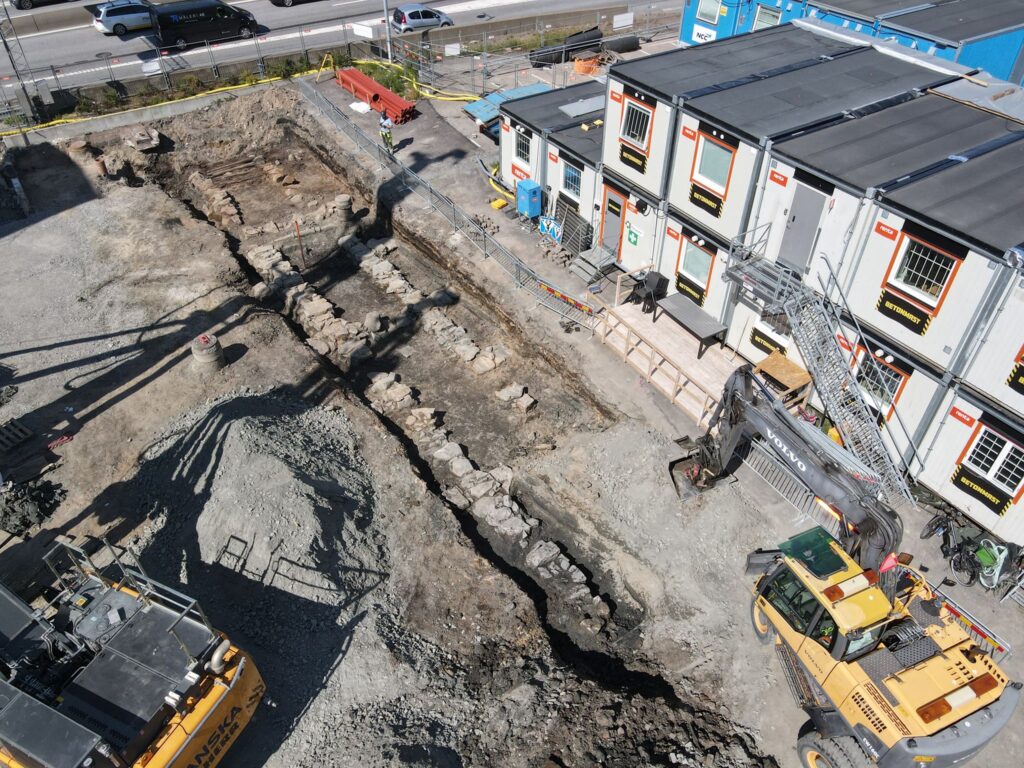 Under de senaste två veckorna har vi hunnit hitta resterna av en pir som sannolikt byggdes under mitten av 1700-talet och som enligt kartorna var i bruk fram tills 1900-talet. Fyndmaterialet är mestadels tidstypiskt för 1700-talet med kritpipor och ostindiskt porslin, men vi har även hittat en flätad mjärde. De stora grävningarna i Masthuggskajen fortsätter i höst.