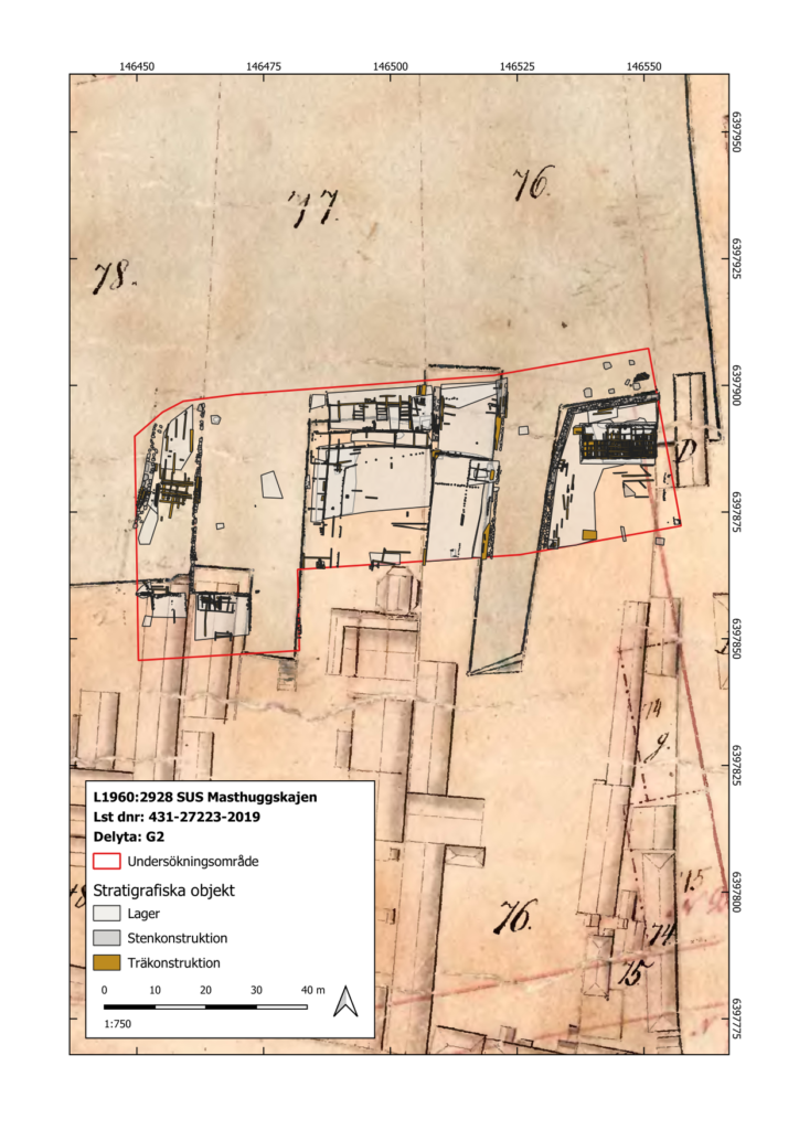 Under året som gått har vi undersökt flera olika ytor inom Masthuggskajen. Den största ytan är belägen nedanför Masthuggstorget mellan Masthamnsgatan och Oscarsleden. Inom ett 4200 kvadratmeter stort område har vi undersökt lämningar inom tre olika masthamnar. Lämningarna bestod framförallt av pirar och hamnbassänger.